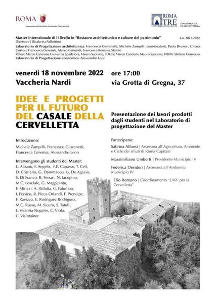 Venerdì 18 novembre 2022 alle ore 17.00 alla Vaccheria Nardi i nostri studenti presenteranno i lavori prodotti nell'ambito del Laboratorio di Progettazione del Master sul Casale della Cervelletta.